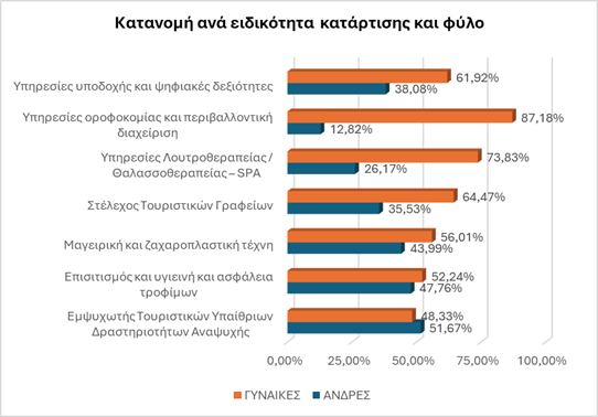 Αξιοσημείωτο είναι και το γεγονός ότι παρουσιάζεται σημαντικά μεγαλύτερη η συμμετοχή των γυναικών στις ειδικότητες Υπηρεσίες οροφοκομίας και περιβαλλοντική διαχείριση (87%) και Υπηρεσίες Λουτροθεραπείας / Θαλασσοθεραπείας – SPA (74%), ενώ οι άντρες φαίνεται να επέλεξαν τις ειδικότητες του επισιτισμού καθώς και των τουριστικών υπαίθριων δραστηριοτήτων.