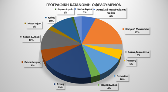 Η γεωγραφική κατανομή των ωφελουμένων αποτυπώνει τον εθνικό χαρακτήρα της δράσης, με ισχυρή παρουσία (70%) σε: